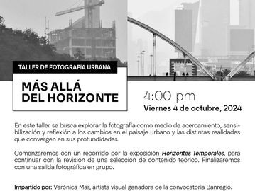 En este taller se busca explorar la fotografía como medio de acercamiento, sensibilización y reflexión a los cambios en el paisaje urbano y las distintas realidades que convergen en sus profundidades. Comenzaremos con un recorrido por la exposición Horizontes Temporales, para continuar con la revisión de una selección de contenido teórico. Finalizaremos con una salida fotográfica en grupo.